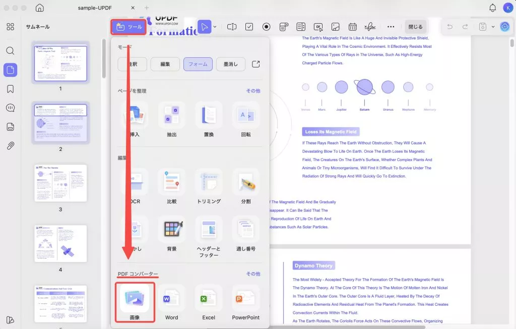 PDFを開いたら、左上隅にある「ツール」から 「PDFコンバーター」へ移動し、「画像」アイコンをクリックます。