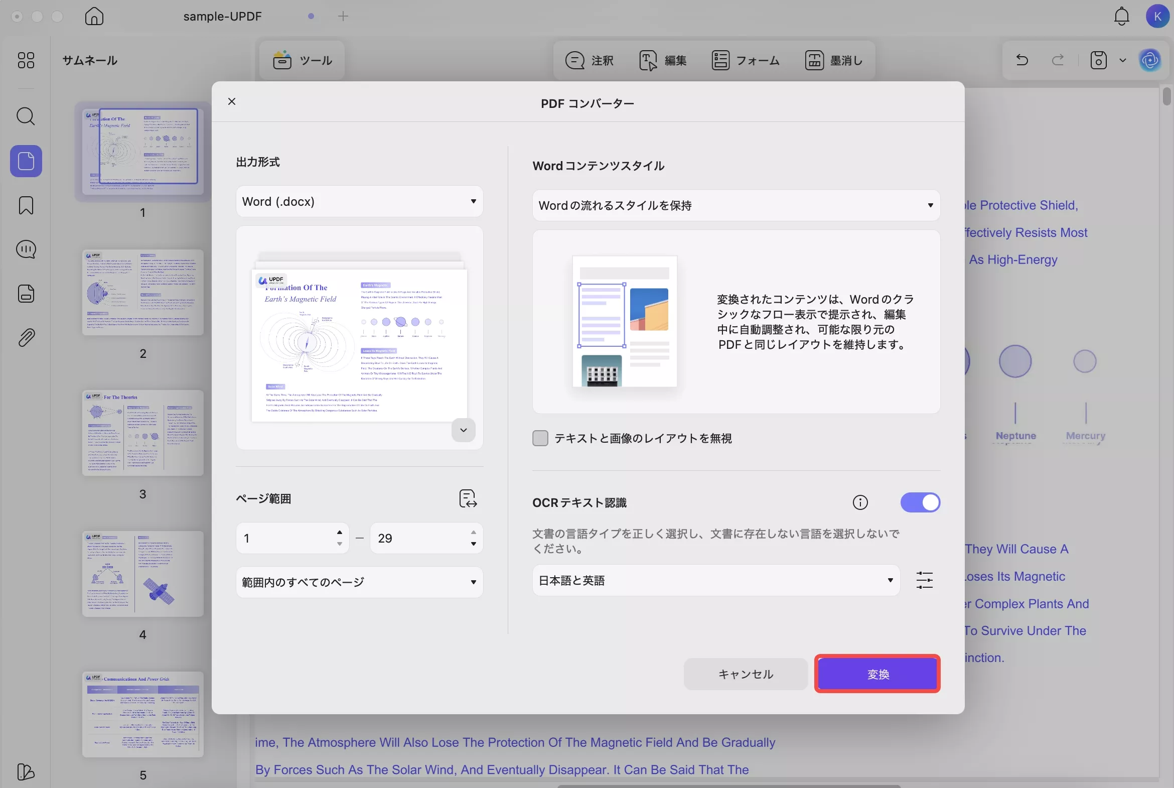 そのような場合は、UPDFのOCR機能(光学文字認識)を使えば、スキャンPDFでも編集可能なWordファイルに変換できます。