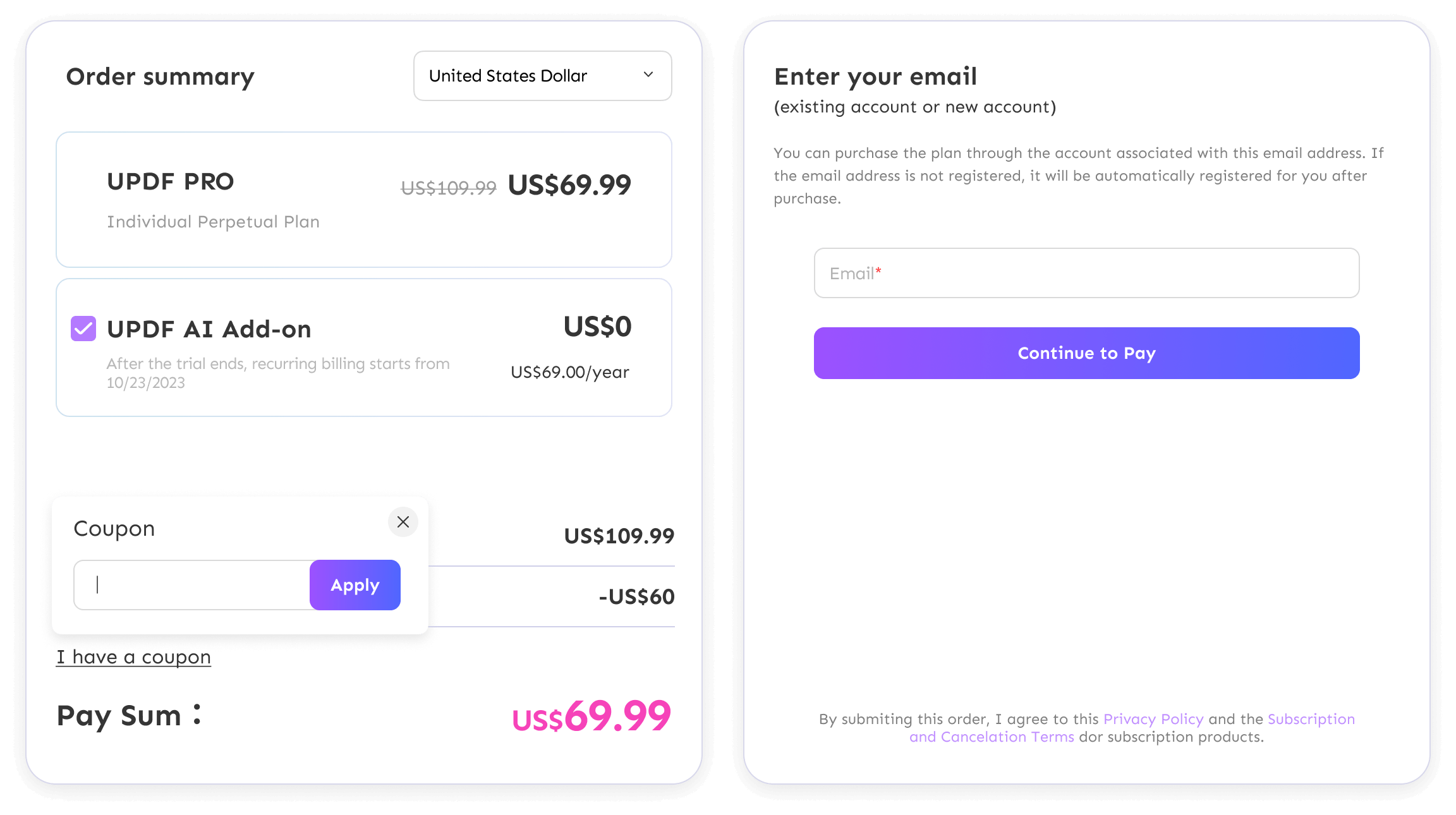 クーポンコード:AFFUPDF5をコピーします。上記でUPDFプランを選択し、「購入する」ボタンをクリックします。これにより、チェックアウトページが表示されます。または、UPDFストアにアクセスしてプランを追加します。