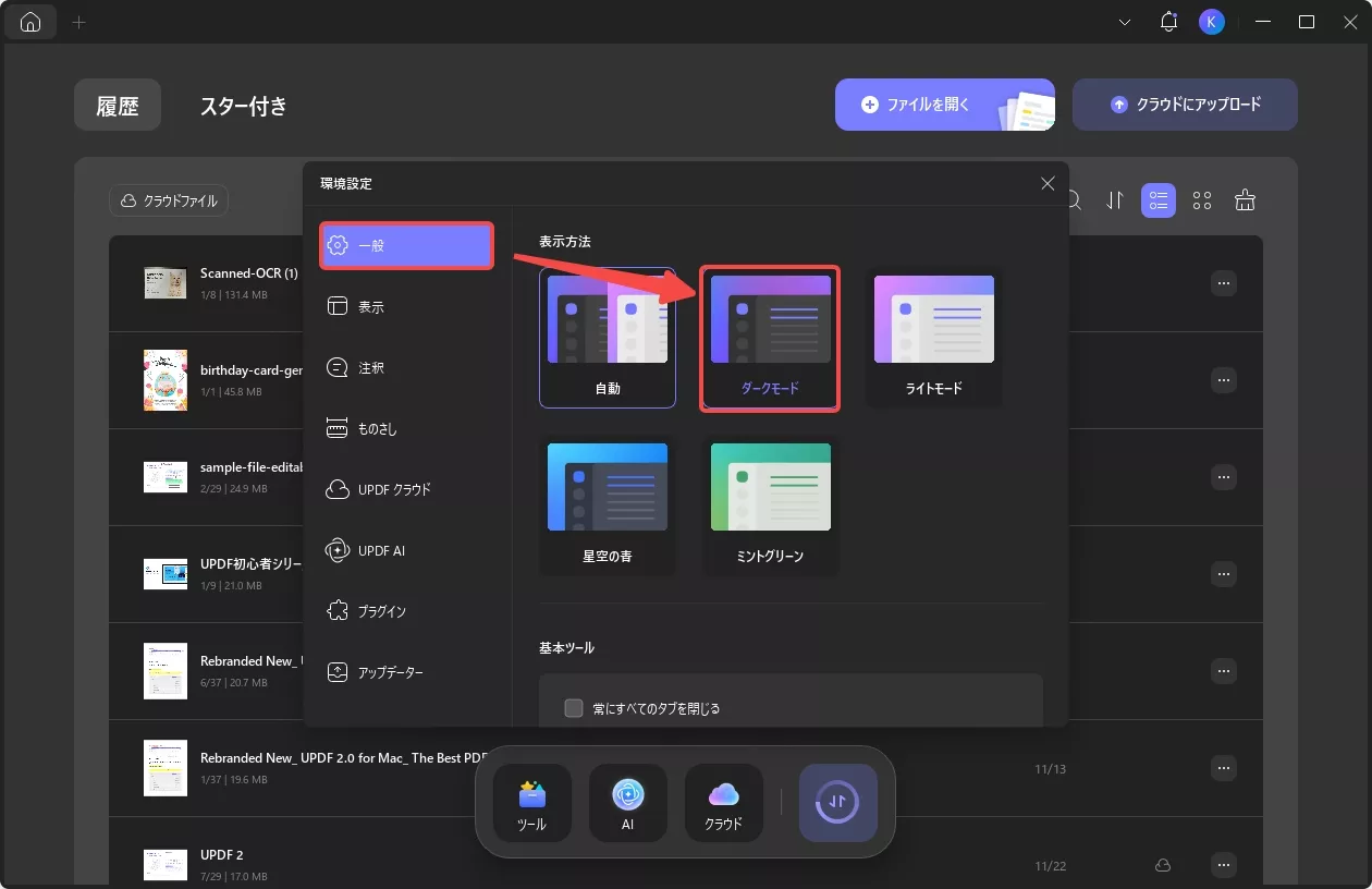 UPDFを起動し、「設定」>「環境設定」>「一般」>「外観」に進み、「ダーク」をクリックしてダークモードに切り替えます。