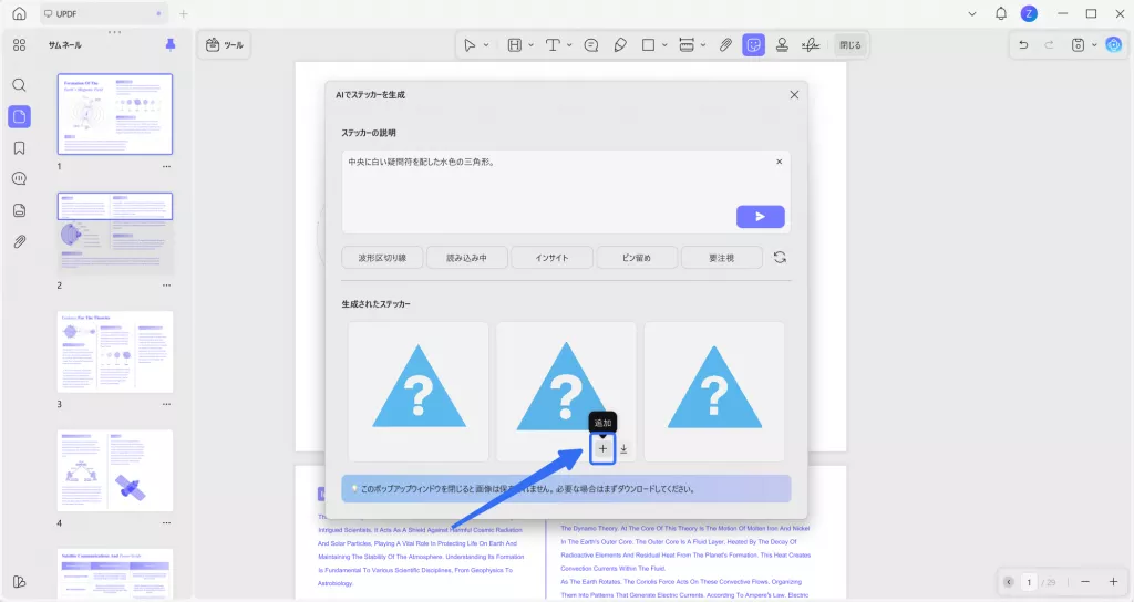 プロンプトを自作する場合でも、プリセットを使用する場合でも、UPDFでは生成したステッカーを直接PDFに配置できます。また、後で使用するためにダウンロードして保存することも可能です。