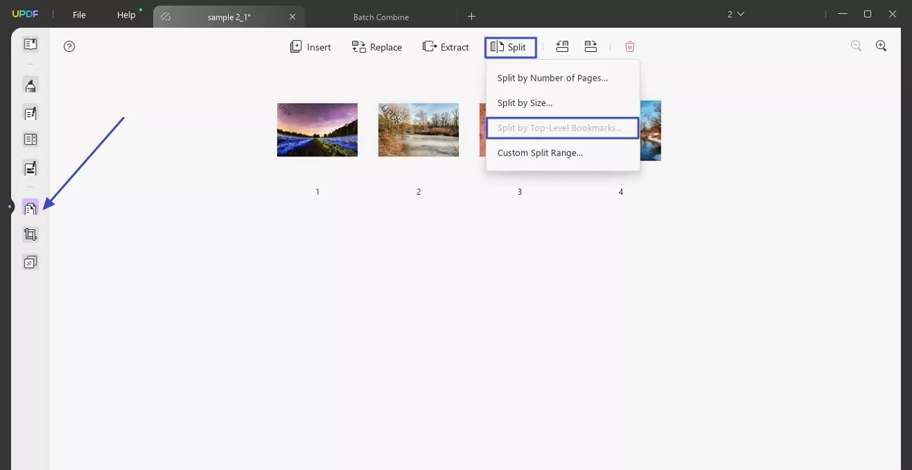 Head to the "Organize Pages" option and opt for the "Split" option at the top of the page. Next, opt for "Split by Top-Level Bookmarks," and the tool will automatically recognize that the document is a merger of several documents.