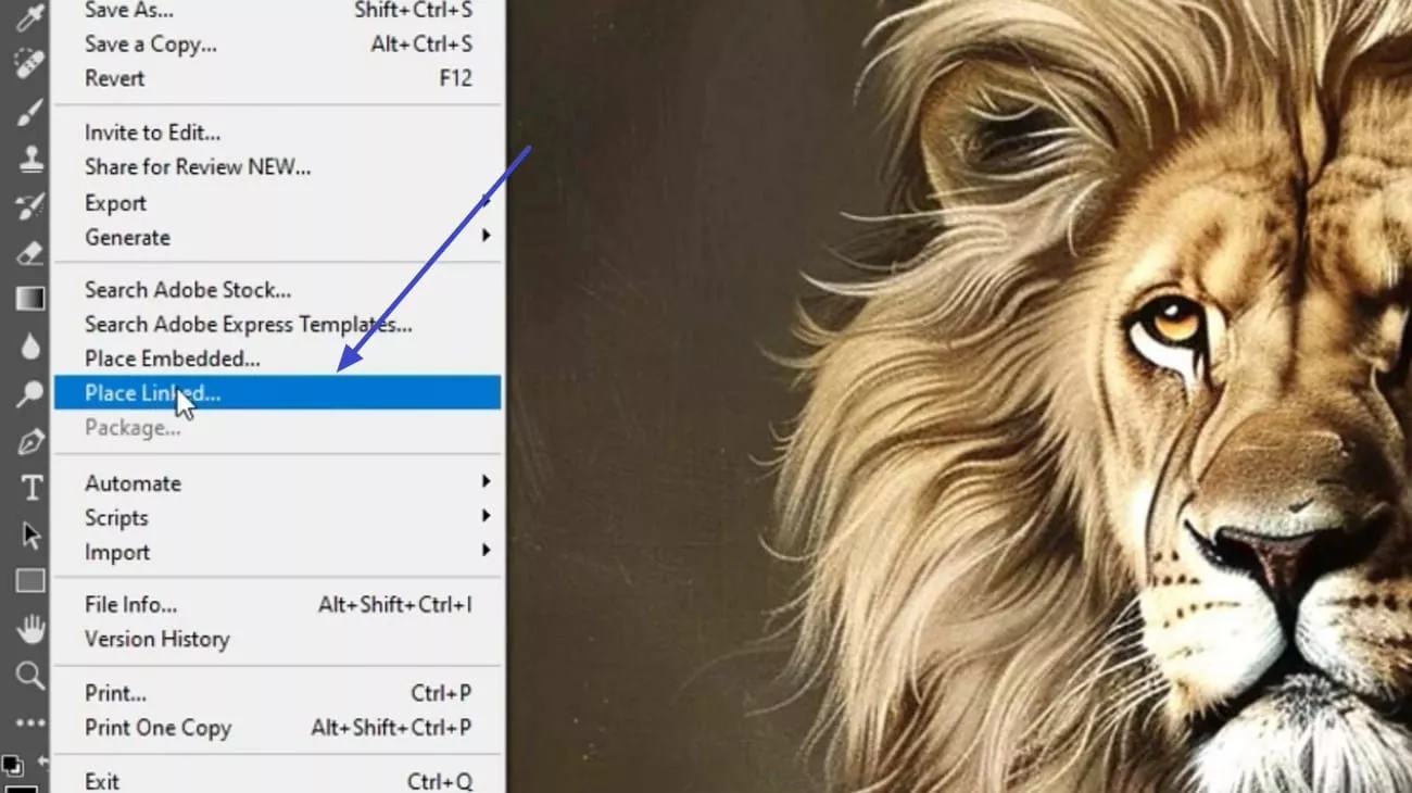 Step 3. Once the action is created, head to the "File" menu and select the "Place Linked" option to apply the saved action to the image.