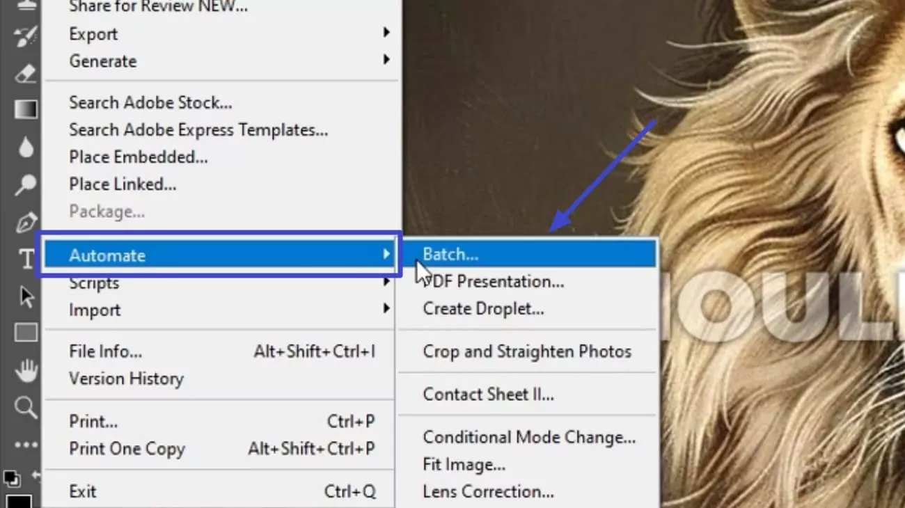 Step 5. Next, click on "Automate" from the drop-down list of "Files" and choose the "Batch" option from the extended menu.