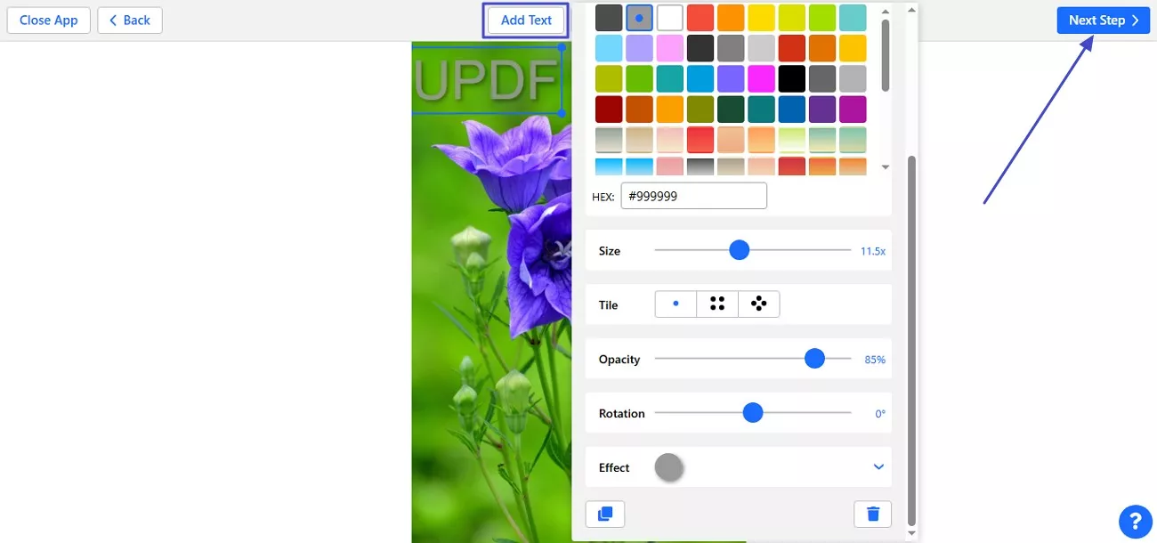 Step 3. Access "Add Text" to type in the watermark and further customize the properties to hit the "Next Step" option.