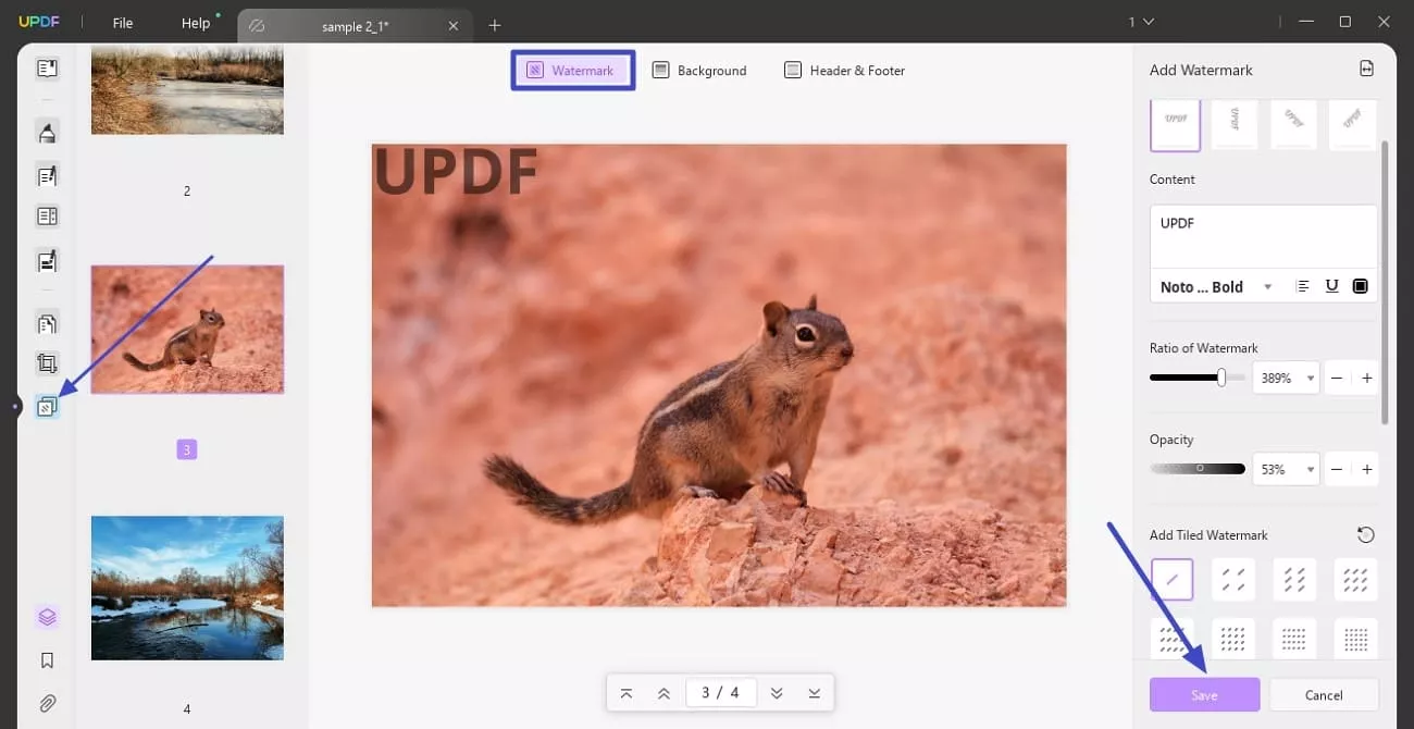 You can use tools like UPDF to batch watermark images without compromising quality. This AI-powered PDF management tool supports converting and organizing documents like PDFs and images. Moreover, users get complete customization when it comes to changing the size using advanced options. They can also specify specific images they want to watermark by selecting the number of pages.