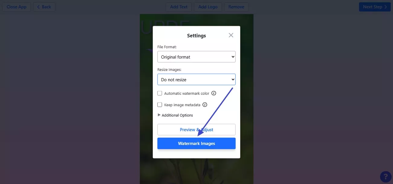 You can use tools like Watermarkly for a quick custom watermark to images in a bulk without having to download a software. It allows users to customize the added text or logo added to the image for protection purposes.