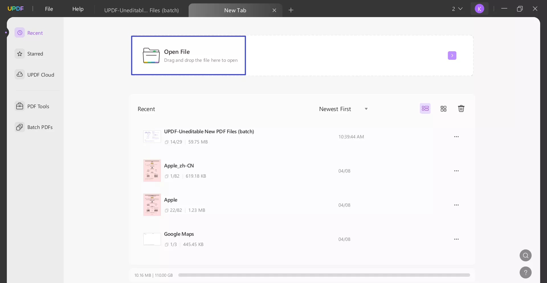 Access the UPDF and choose the "Open File" button to import the required PDF.