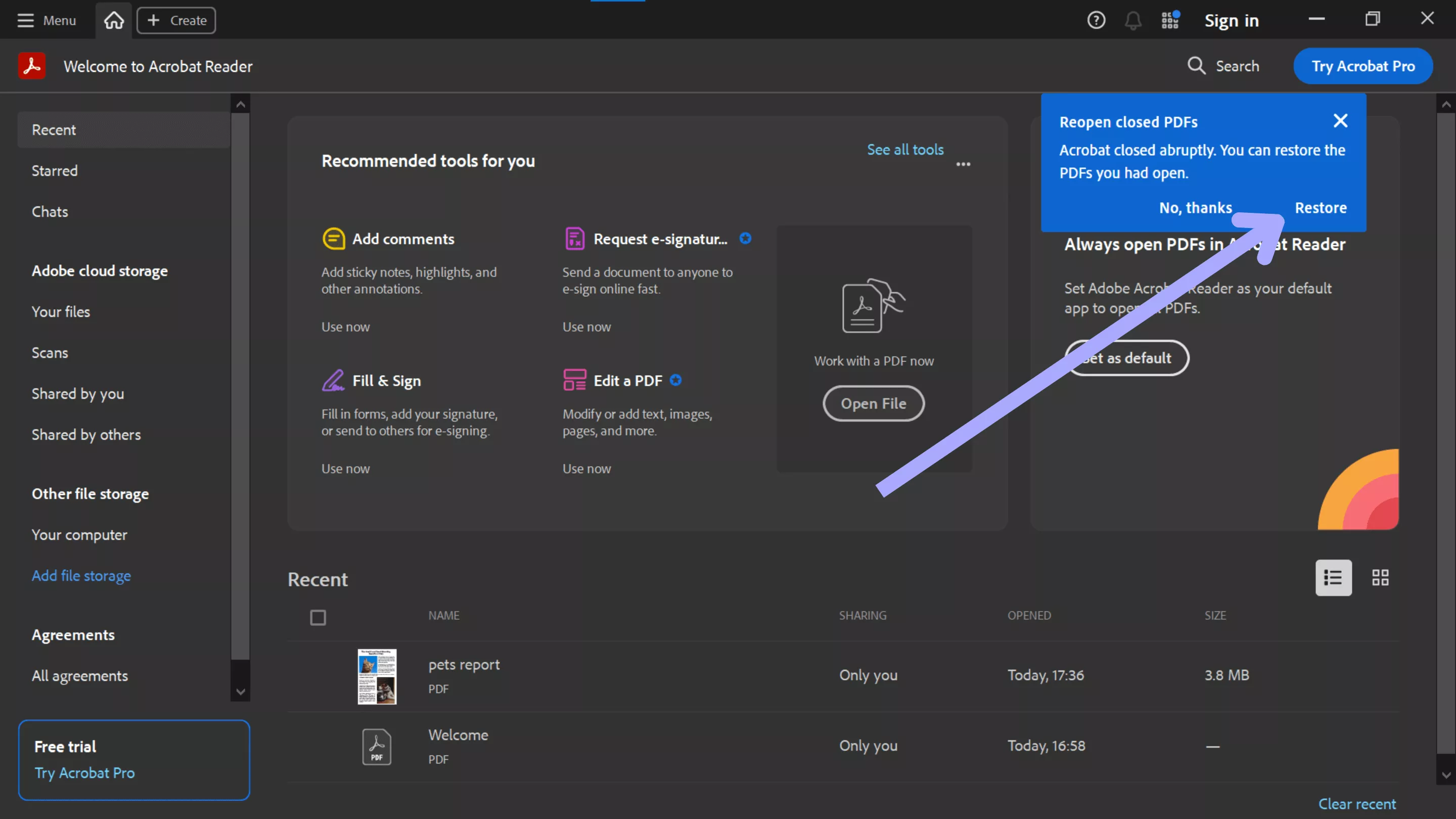 After Adobe Acrobat has crashed, reopen the application. You should see a notification in the top right corner of your screen titled ‘Reopen closed PDFs.’ Simply click ‘Restore’ to recover your unsaved document, allowing you to continue where you left off.