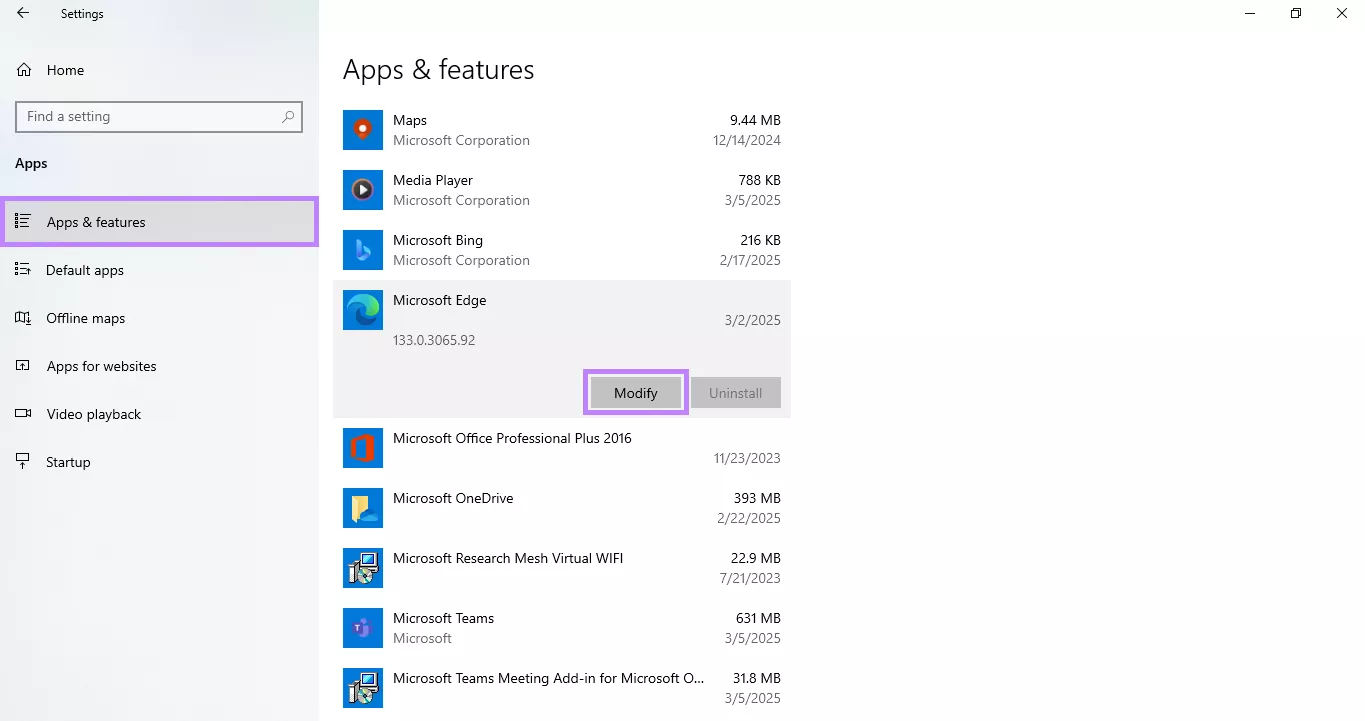 - Scroll down and find "Microsoft Edge" in the list. Click it and select Modify. (The uninstall option must be greyed out)