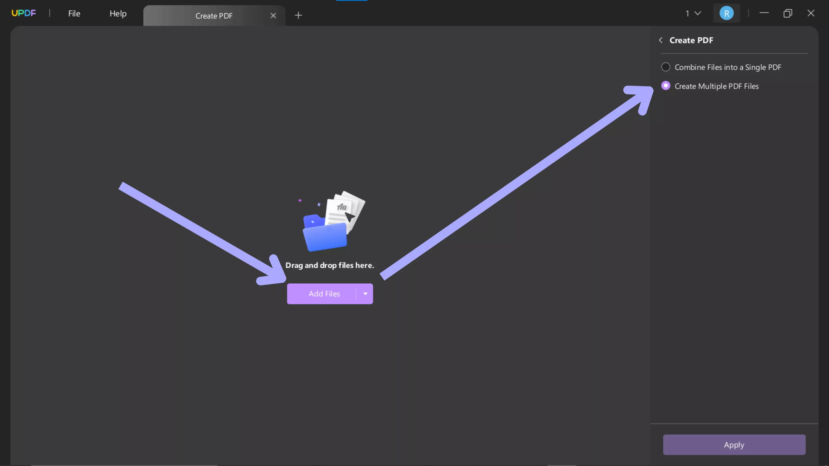 Select ‘Add Files’ to import your documents in the new page that opens. On the screen's right side, you can combine the files into a single PDF or create multiple documents from the imported files.