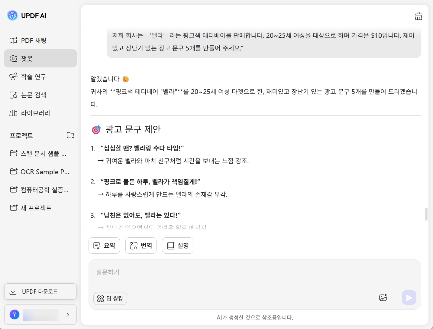 이들은 제품 페이지, 소셜 미디어 광고, 짧은 영상 스크립트 또는 프로모션 캠페인을 위해 많은 광고 문구가 필요합니다. UPDF AI 생성기는 창의적이고 매력적인 판매 포인트를 몇 초 만에 만들어 줍니다.