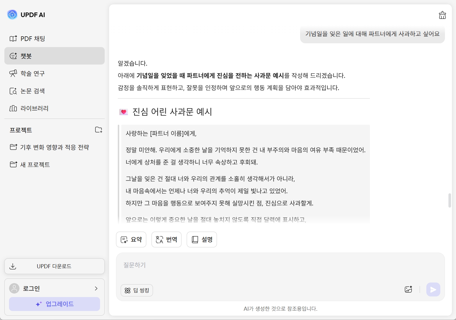 UPDF AI 사과문 생성기