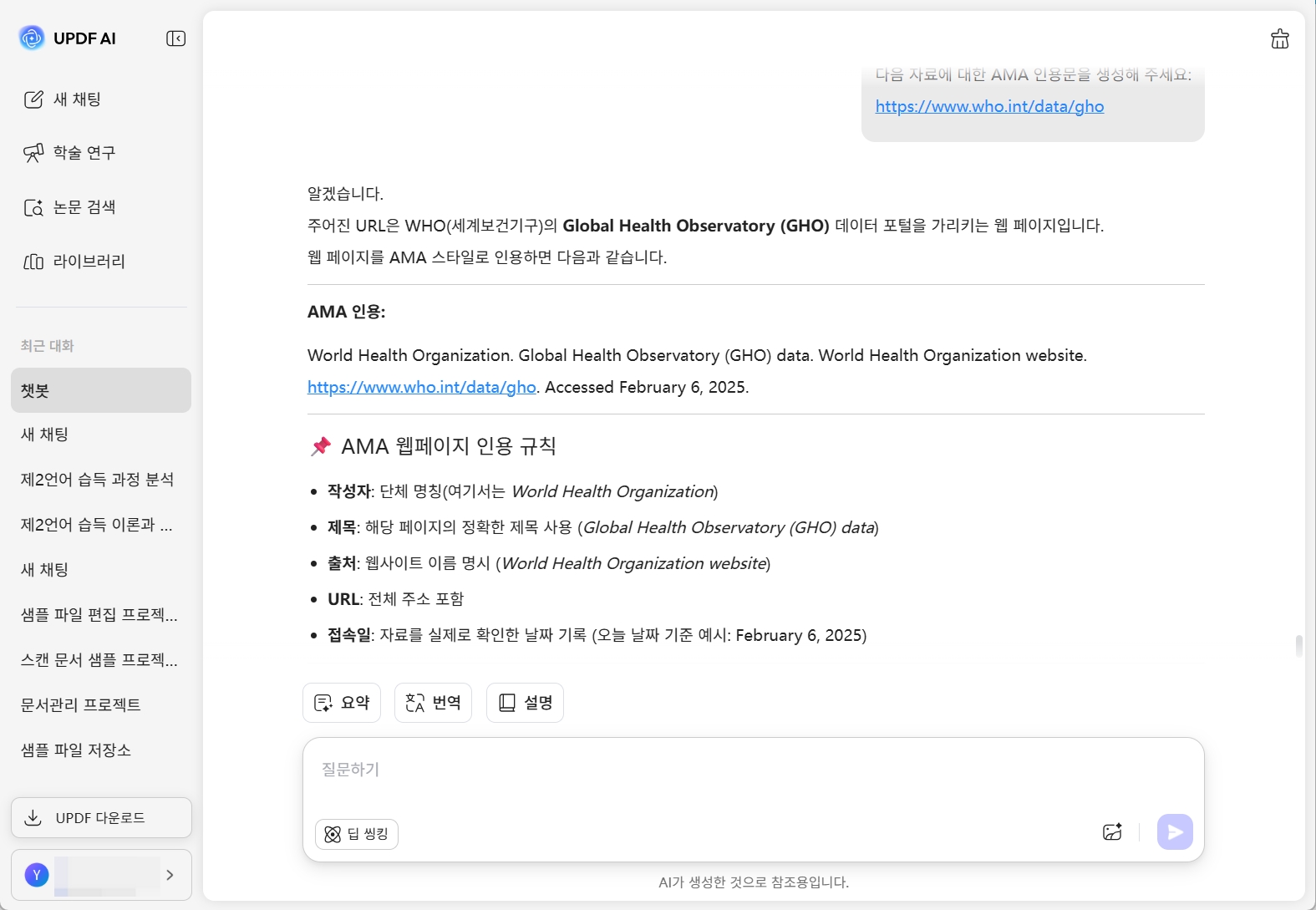 보내기 버튼을 누르면 AI가 즉시 정확하고 바로 사용할 수 있는 AMA 인용을 생성합니다.