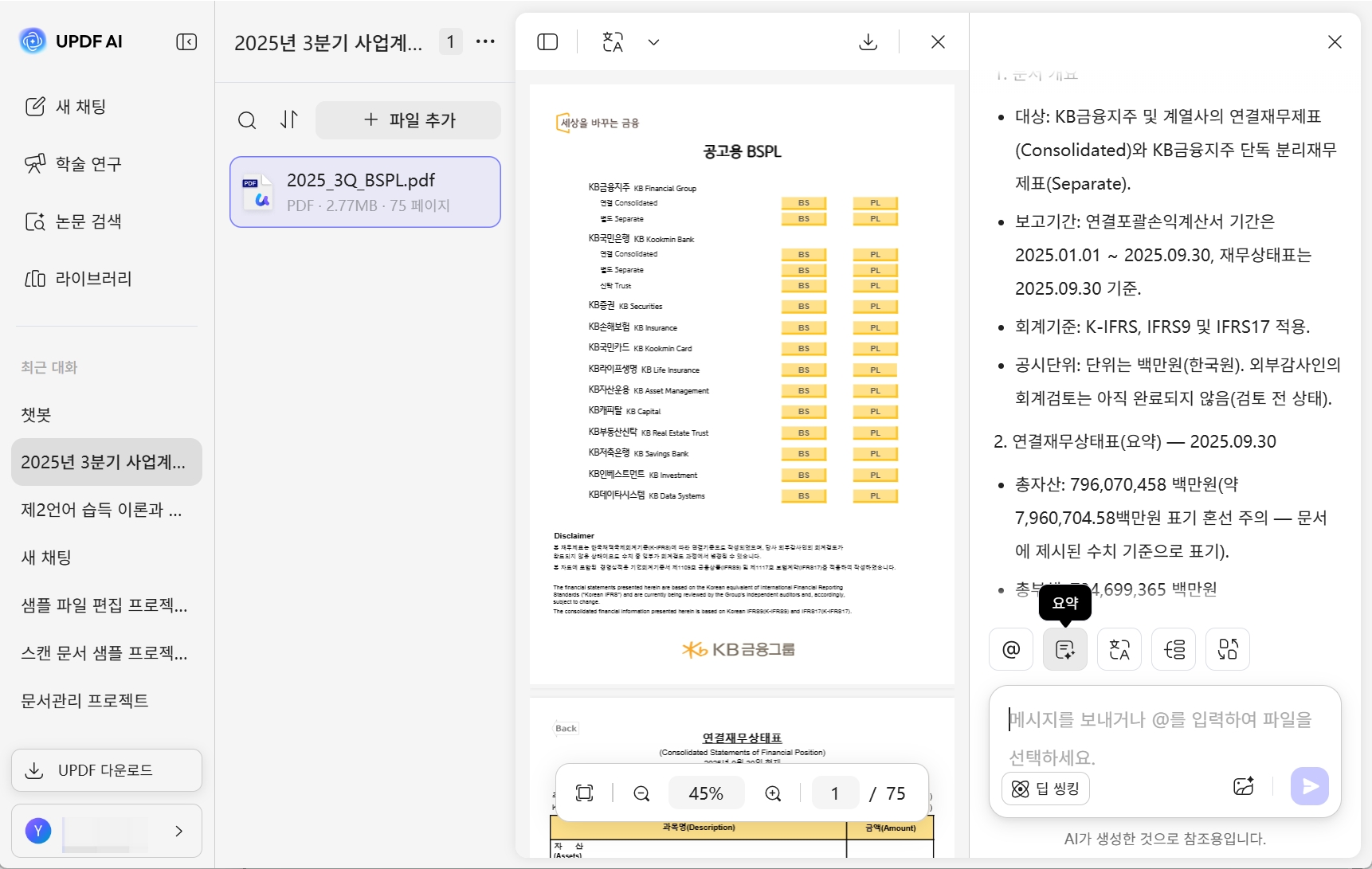 즉시 결과 확인: “재무제표 분석”을 입력하거나 요약 보고서를 요청하면, UPDF AI가 몇 초 만에 명확하고 실행 가능한 인사이트를 생성합니다.