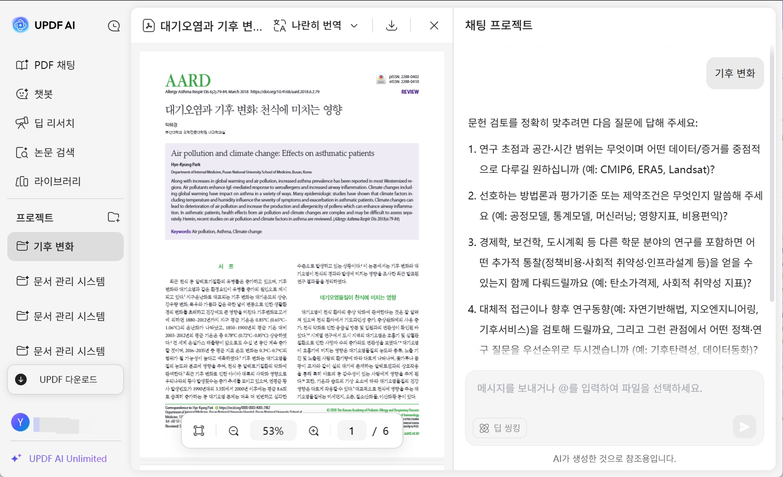 키워드를 프롬프트로 전송하면, UPDF AI가 답변해야 할 질문 목록을 제공합니다. 각 질문의 답변을 텍스트 박스에 입력하고 UPDF AI가 리서치 과정을 시작하도록 합니다.