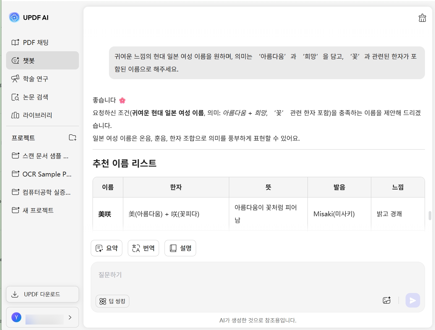 일본으로 여행이나 유학을 가시나요? UPDF AI 일본식 이름 생성기를 사용하면, 현지인과 자연스럽게 교류할 수 있는 자신만의 일본 이름을 손쉽게 만들 수 있어 더 특별한 경험을 할 수 있습니다.