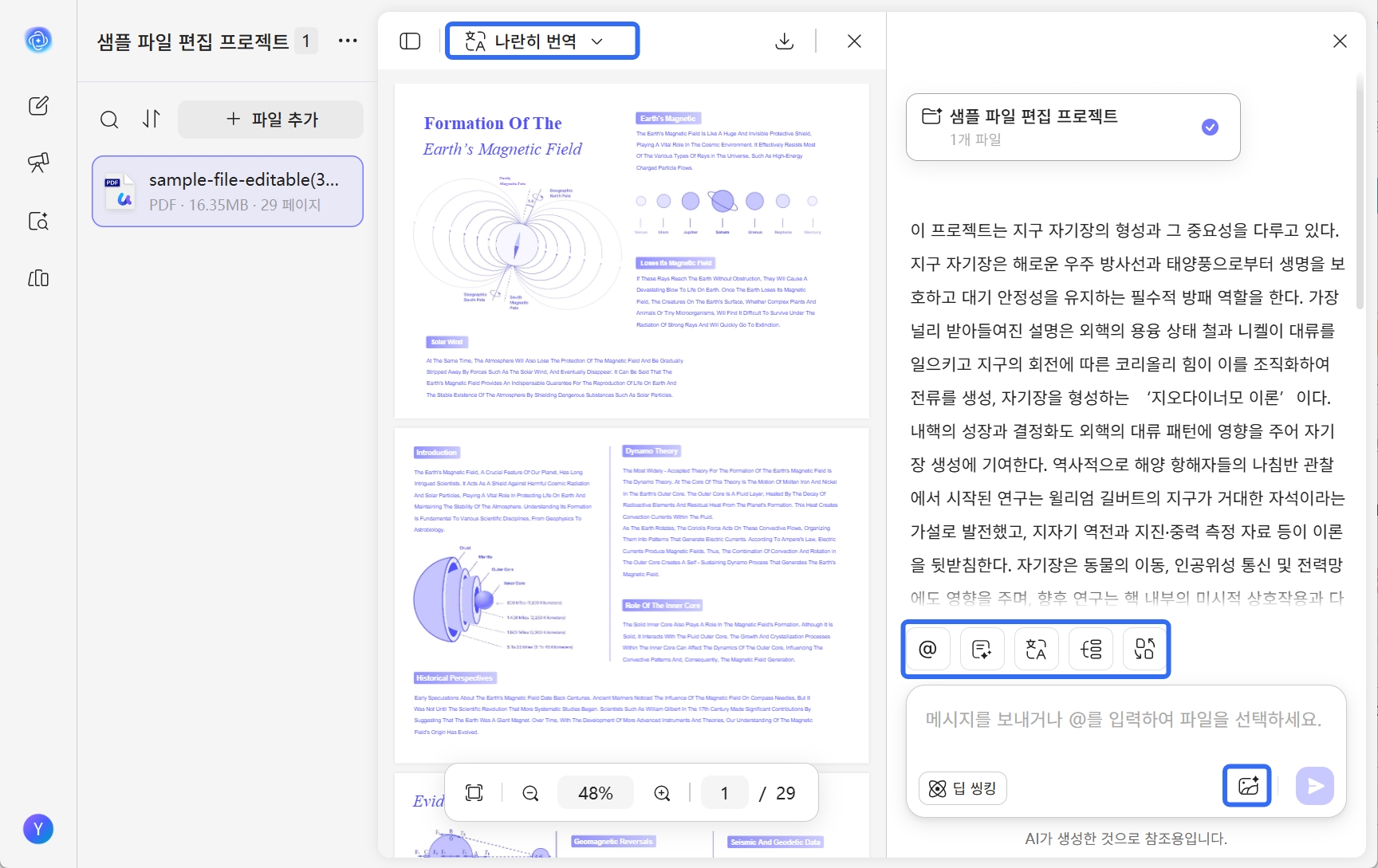 단계: 파일이 로드되면 AI에게 추출하거나 탐색하고 싶은 내용을 입력할 수 있습니다. 예를 들어, “이 논문을 분석하고 핵심 결과를 모두 추출” 또는 “이 보고서를 검토하고 주요 통계, 위험 요소, 인사이트 강조”와 같은 프롬프트를 입력할 수 있습니다. 또한 인터페이스 하단에는 요약, 마인드맵, 변환, 번역과 같은 빠른 실행 버튼이 있어 일반적인 분석 작업을 즉시 시작할 수 있습니다.