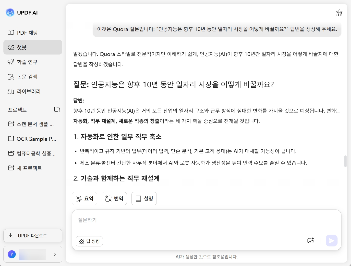 몇 초 만에 잘 구조화되고 통찰력 있는 Quora 답변을 생성할 수 있습니다 — 수시간 동안 조사하거나 직접 작성할 필요가 없습니다. UPDF AI가 전체 과정을 간소화하여 지식 공유와 커뮤니티 참여에 더 효율적으로 집중할 수 있도록 돕습니다.