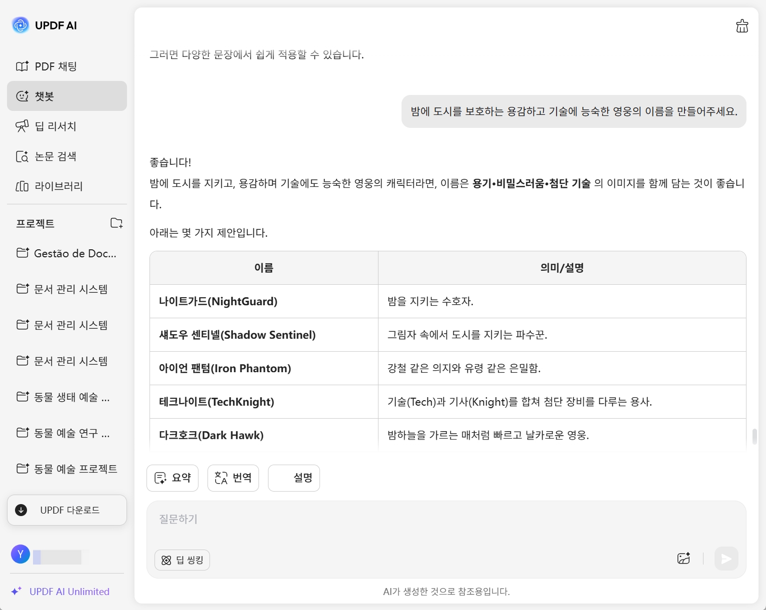 먼저, 영웅의 특징, 능력 또는 테마를 입력합니다. 예: “밤에 도시를 보호하는 용감하고 기술에 능숙한 영웅의 이름을 만들어주세요.” 원하는 스타일(영웅적, 신비로운, 장난스러운 등)도 선택할 수 있습니다.