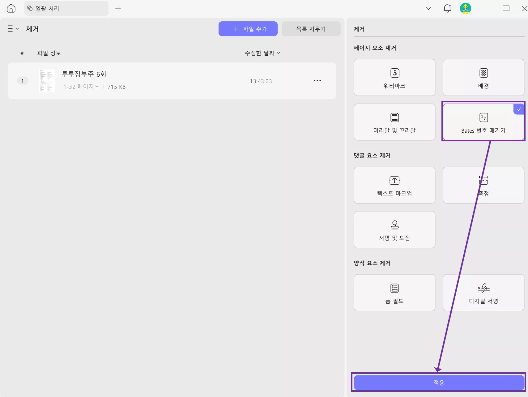 - "+ 파일 추가" 버튼을 클릭하여 베이츠 번호를 제거할 PDF 파일을 업로드합니다.