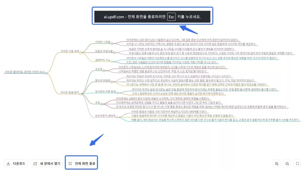 마인드맵이 생성되면 “확대” 또는 “축소” 기능을 사용하여 세부 내용을 꼼꼼히 확인할 수 있습니다. 또는 "페이지에 맞추기" 버튼을 사용하여 전체 마인드맵을 볼 수도 있습니다. "전체 화면" 버튼을 클릭하면 마인드맵을 전체 화면 모드로 볼 수 있습니다. 결과물이 만족스럽다면, 상단의 “다운로드” 아이콘을 클릭하여 마인드맵을 기기에 저장하세요.