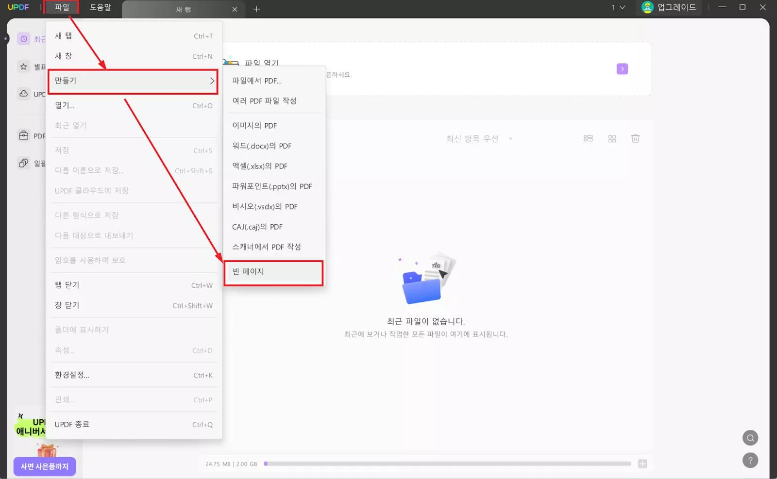2단계: 이어서 ‘만들기’를 클릭한 다음 ‘빈 페이지’를 선택하세요. PDF 이름, 페이지 수, 용지 크기 및 스타일 등을 설정한 후 ‘만들기’를 클릭하면 빈 PDF가 생성됩니다.
