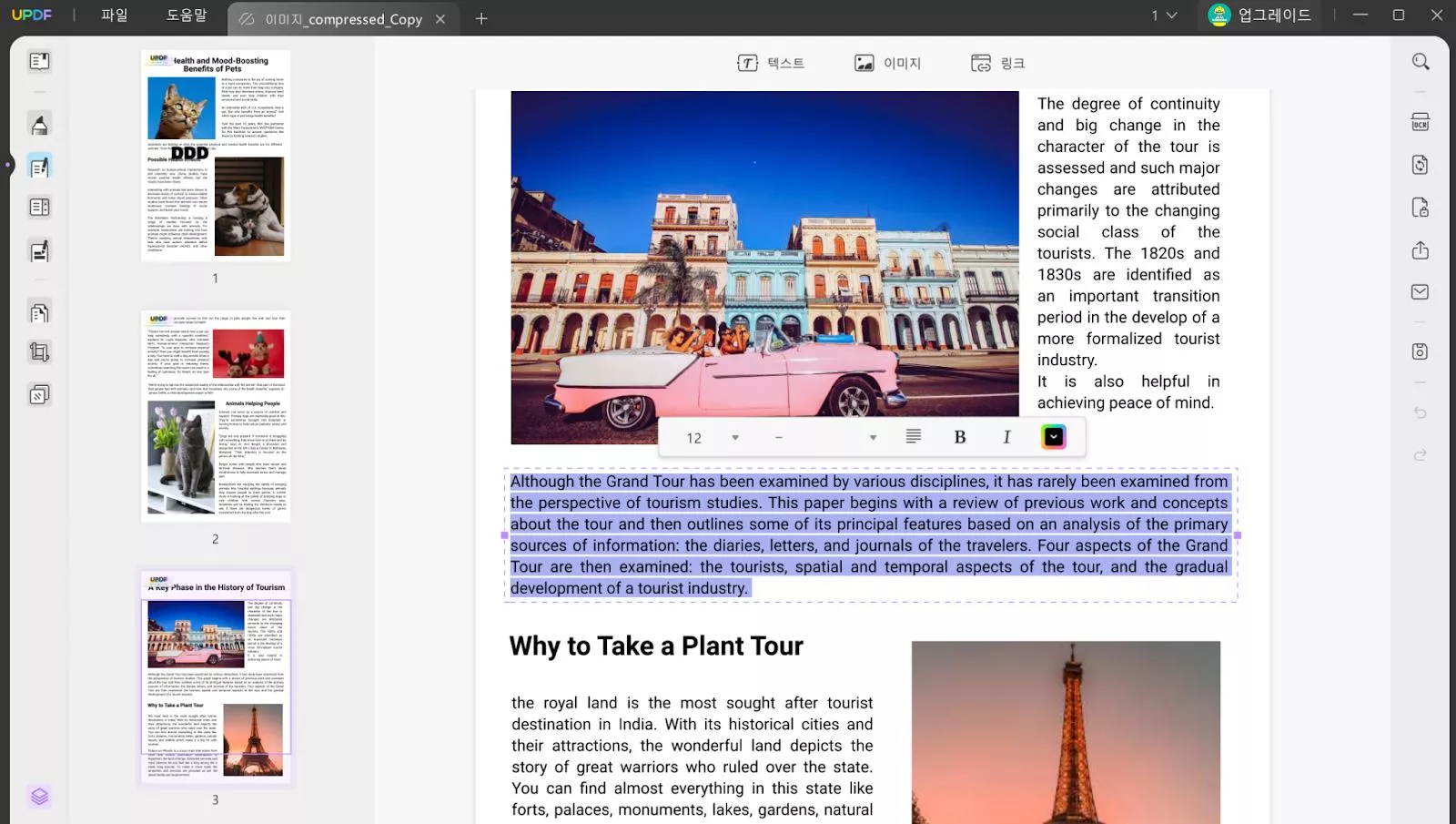 3단계: 기존 PDF에서 불필요한 정보가 있거나 편집이 필요한 경우, 해당 PDF를 UPDF로 열고 왼쪽 툴바에서 ‘PDF 편집’을 선택합니다. 편집하려는 텍스트, 이미지, 링크를 클릭하면 바로 수정 가능하며, 상단 메뉴의 ‘텍스트’, ‘이미지’, ‘링크’ 아이콘을 이용해 원하는 위치에 새로 추가할 수도 있습니다.