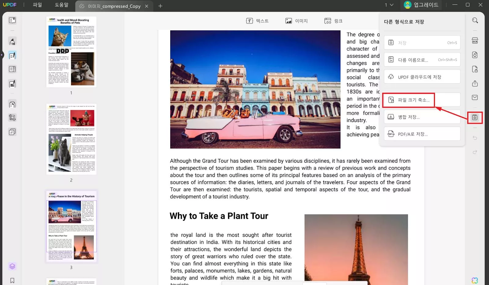 4단계: PDF 파일이 너무 커서 압축이 필요하다면, ‘다른 이름으로 저장’ > ‘파일 크기 줄이기’로 이동해 압축 품질과 크기를 선택하면 됩니다.