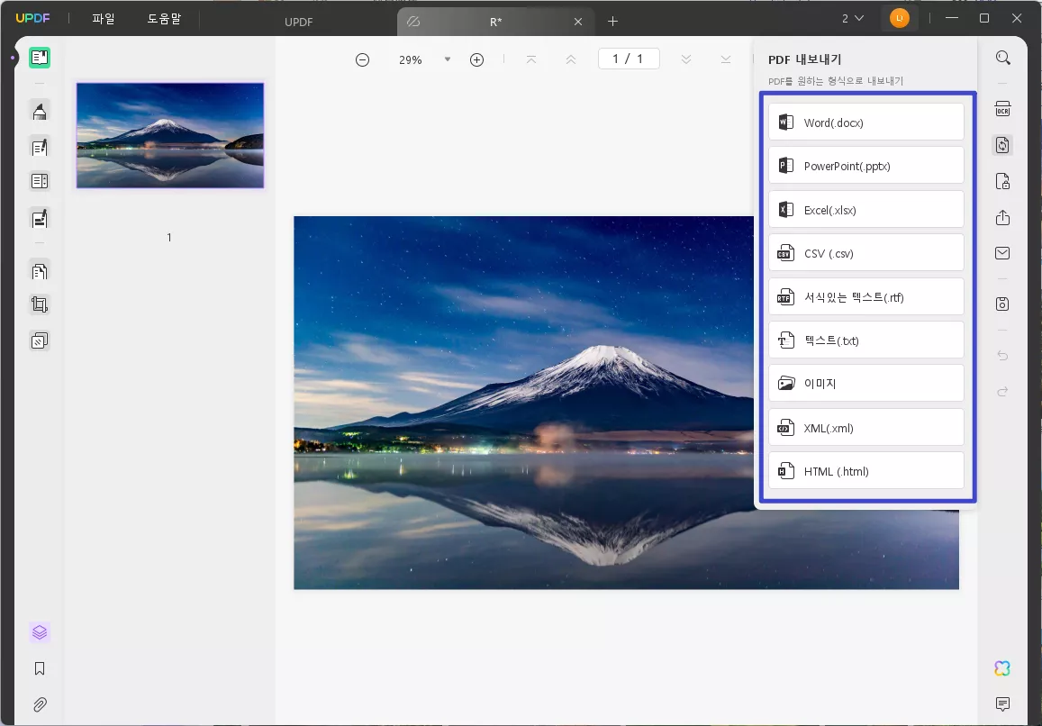 - 이미지를 PDF, Word, Excel, PPT, RTF, CSV, HTML 등으로 변환할 수 있습니다.