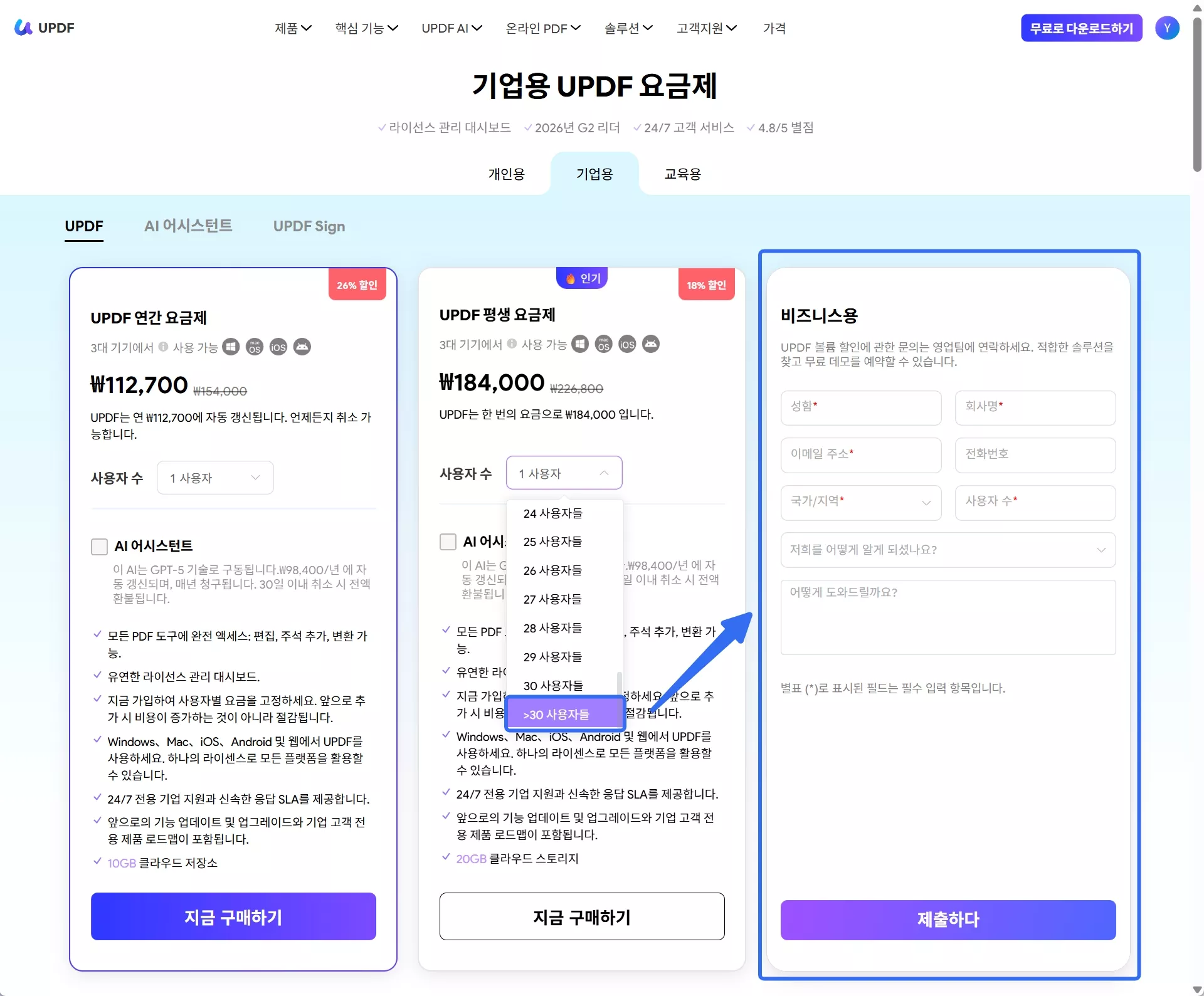 엔터프라이즈 요금제 구매 페이지에 있을 때, 제품을 선택해야 합니다. 선택 가능한 옵션은 UPDF, AI Assistant, UPDF Sign입니다. 예를 들어, UPDF를 구매하려면 "UPDF" 섹션에 머무르세요. 이제 UPDF 연간 요금제 또는 평생 요금제를 선택할 수 있습니다.