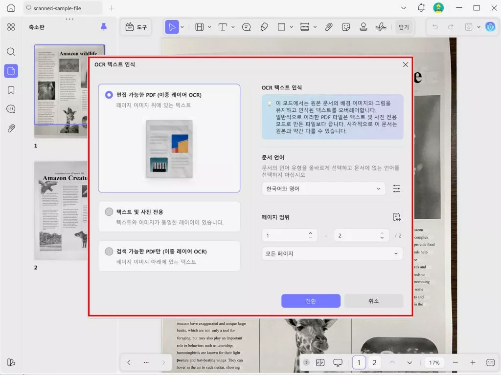 이어지는 작은 창에서 라디오 버튼을 선택하여 "편집 가능한 PDF" 옵션이나 "텍스트 및 그림만" 또는 "검색 가능한 PDF"와 같은 다른 옵션을 선택합니다. 오른쪽에서 제공된 옵션 중 언어와 페이지 범위를 선택합니다. 완료되면 하단에 위치한 "변환" 버튼을 눌러 프로세스를 실행합니다.