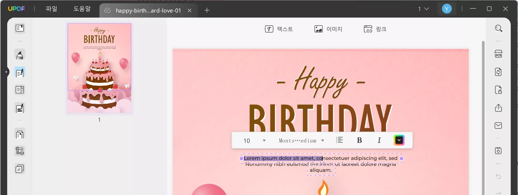 왼쪽 도구 모음을 사용하여 생일 카드를 원하는 대로 맞춤화할 수 있습니다. 도구 모음에서 "PDF 편집"을 선택하고 "텍스트"를 클릭하여 생일 축하 메시지를 카드에 추가하세요. "이미지" 옵션을 클릭하여 이미지를 추가할 수도 있습니다. PDF에서 직접 텍스트를 맞춤화하고 편집할 수 있습니다.
