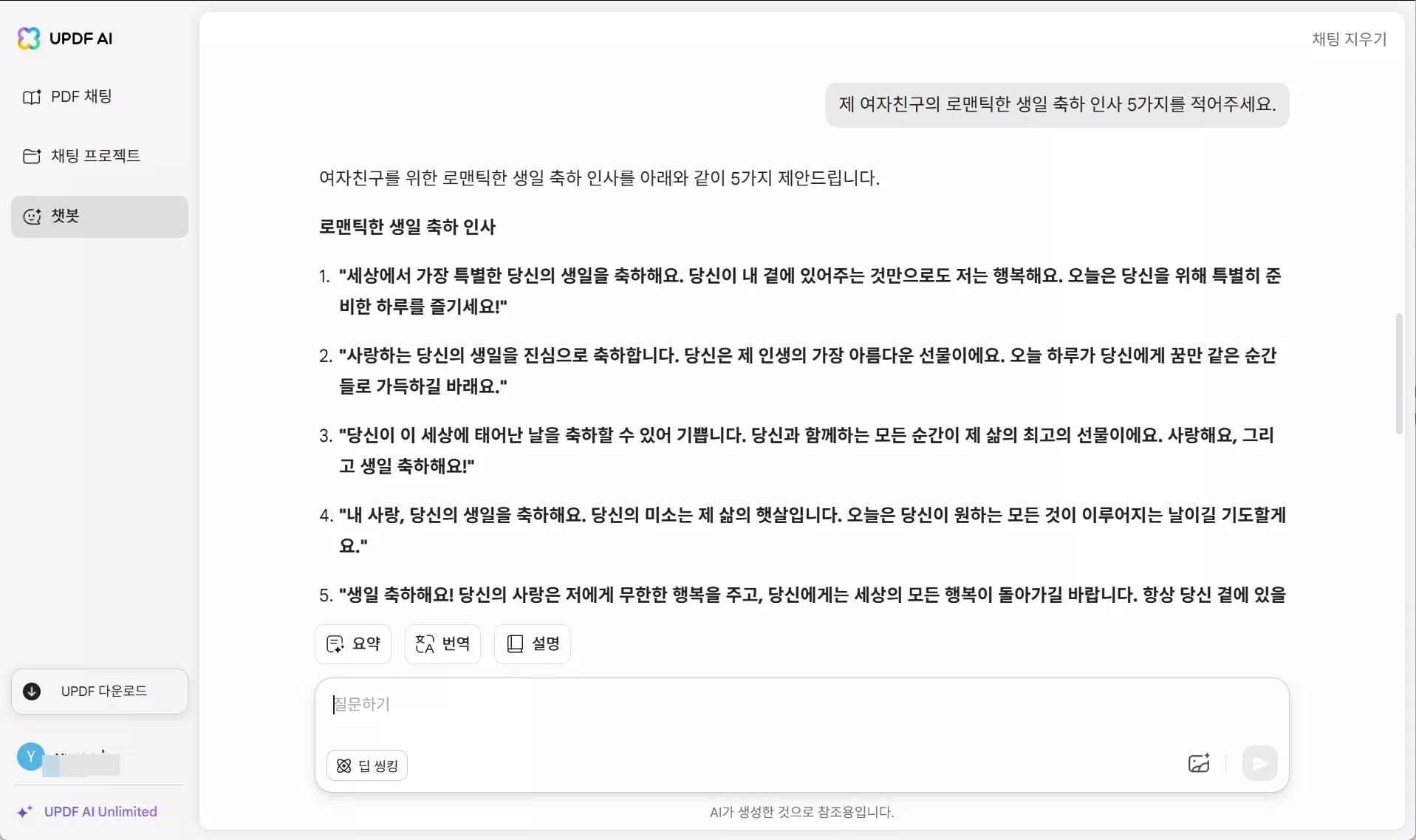 UPDF를 다운로드하면 UPDF AI에게 30개의 무료 질문을 할 수 있으며, 여자친구를 위한 10개 또는 100개의 독특한 생일 축하 메시지를 작성해 달라고 요청할 수도 있습니다!