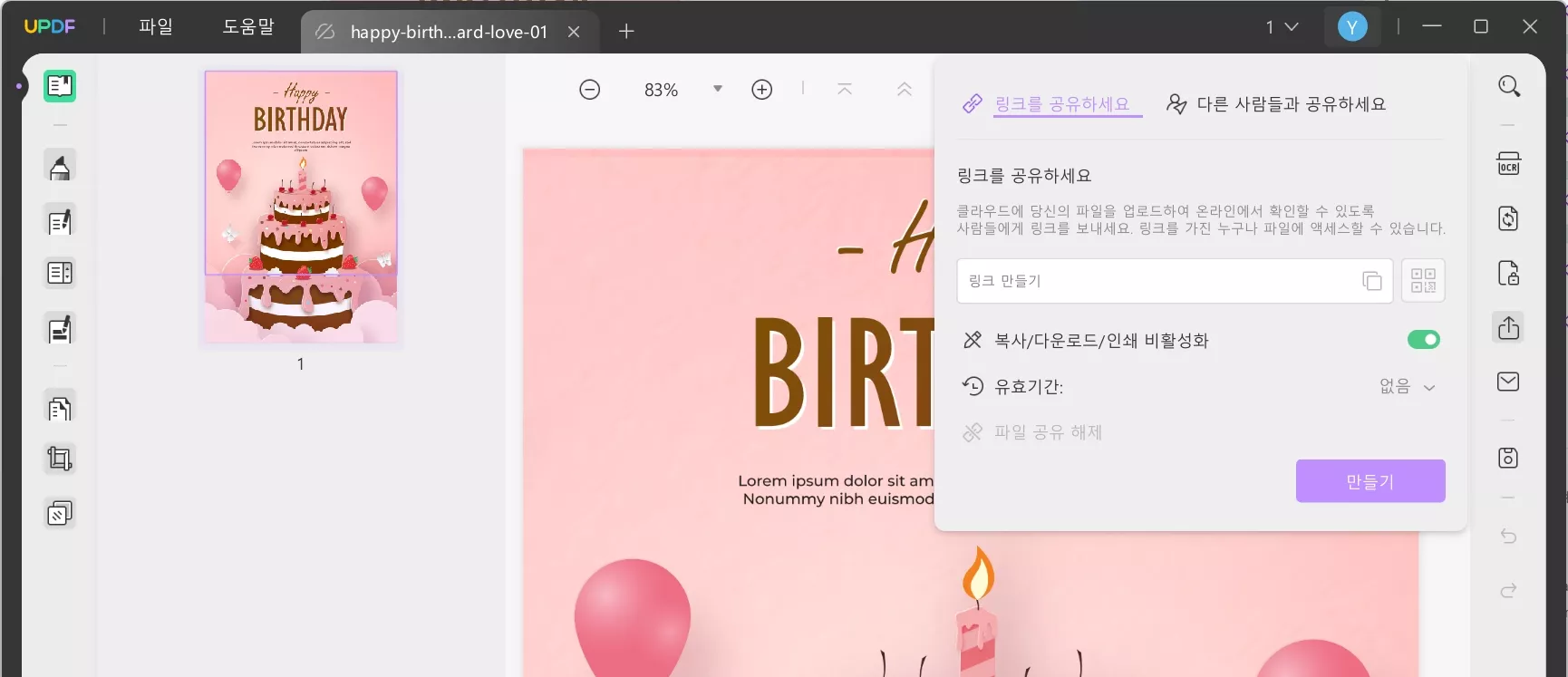 원하는 생일 카드가 완성되면, UPDF를 통해 바로 여자친구와 공유할 수 있습니다. 이 도구를 통해 PDF를 공유하는 방법은 두 가지가 있습니다. "이 파일을 다른 사람과 공유" 옵션을 사용하여 링크로 파일을 공유하거나, 오른쪽 사이드바에서 "이메일로 파일 보내기" 옵션을 선택하여 생일 카드를 이메일로 보낼 수 있습니다.