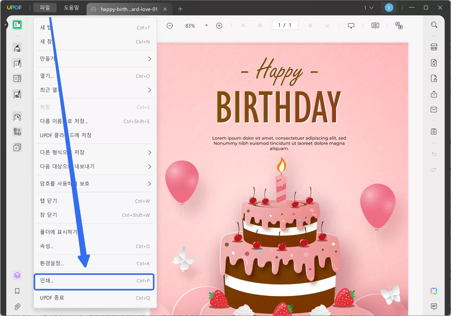 생일 카드를 하드카드로 만들고 싶으신가요? 그렇다면 UPDF를 통해 쉽게 인쇄할 수 있습니다. 왼쪽 상단의 "파일" 탭을 클릭하고, 메뉴에서 "인쇄"를 선택하여 생일 카드 인쇄를 진행할 수 있습니다.