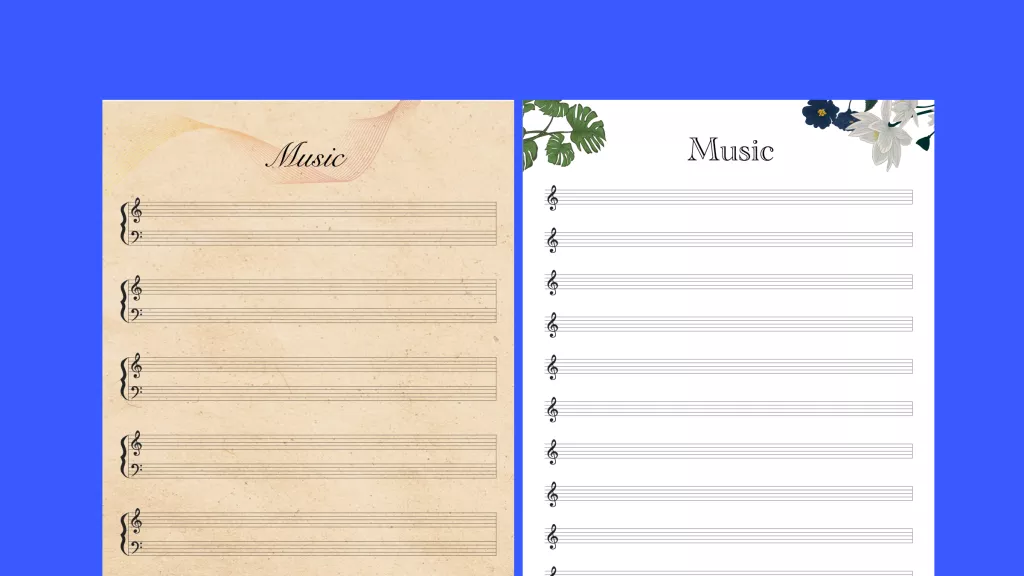 또한, 멜로디 연구를 하는 음악가들은 이 빈 악보 템플릿을 사용하여 다양한 멜로디를 표기하고 분석할 수 있습니다. 각 빈 악보 PDF 템플릿의 시스템은 특정 연습, 음악 개념 또는 음계에 초점을 맞추고 있습니다. 또한, 복잡하고 다면적인 음악 작품을 위한 포괄적인 표기법을 제공합니다. 이 빈 오선지에는 꽃무늬 배경이 있어 음악 연습에 미적인 아름다움을 더해줍니다.