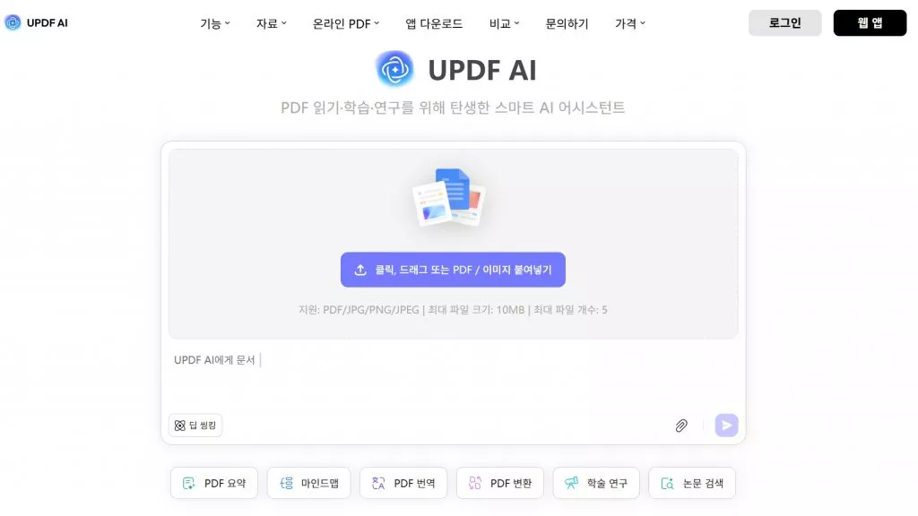 1단계. 시작하려면 https://ai.updf.com/kr/를 방문하거나 아래 버튼을 클릭하여 UPDF AI의 채팅 PDF 인터페이스를 엽니다. 인터페이스가 열리면 "클릭, 드래그 또는 PDF/이미지 붙여넣기" 버튼을 탭하여 PDF 문서를 가져옵니다.