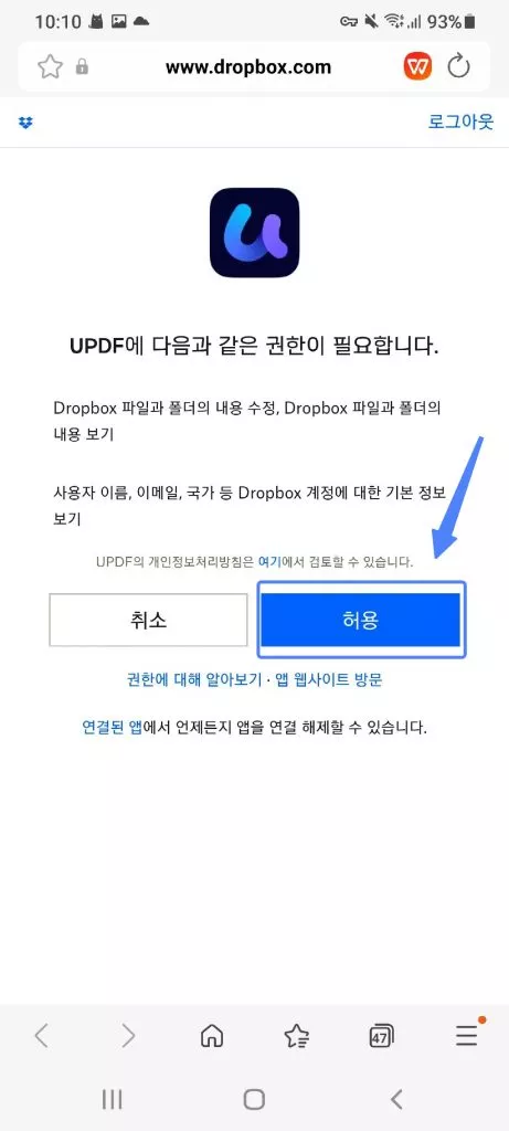 - Dropbox에 로그인하면 권한을 요청합니다. 권한을 검토한 후 파란색 "허용" 버튼을 눌러 UPDF가 Dropbox에 있는 파일을 보고 편집할 수 있도록 권한을 부여해야 합니다.
