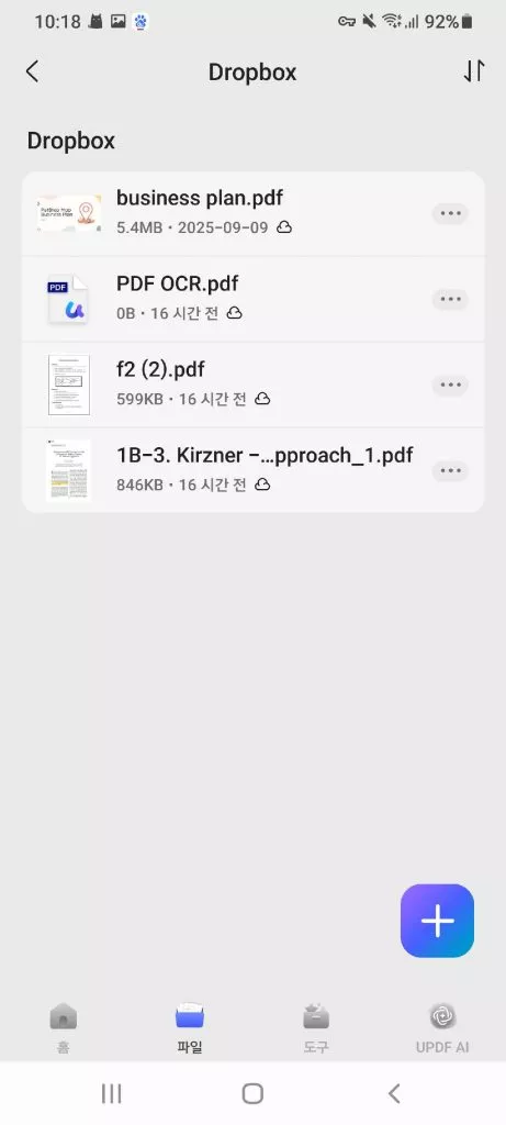1단계. 이전에 UPDF를 사용한 적이 없다면 먼저 아래의 " + " 버튼을 클릭하여 Android 기기에서 UPDF로 파일을 가져오세요. UPDF를 사용하면 로컬 기기와 클라우드 드라이브(Dropbox)에서 파일을 가져올 수 있으며, 이 두 가지 방법으로 파일을 불러올 수 있습니다.