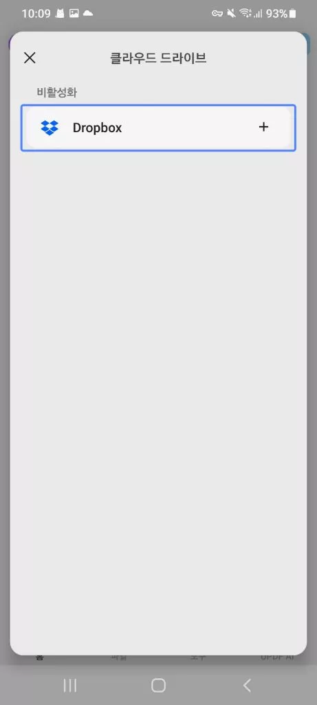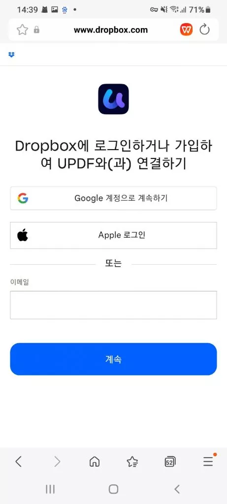 - Dropbox 파일을 UPDF로 가져오려면 먼저 Dropbox 계정을 연결해야 합니다. "클라우드 드라이브" 화면에서 Dropbox 옆에 있는 파란색 "+" 버튼을 탭하세요. Dropbox 인증 페이지가 열립니다.