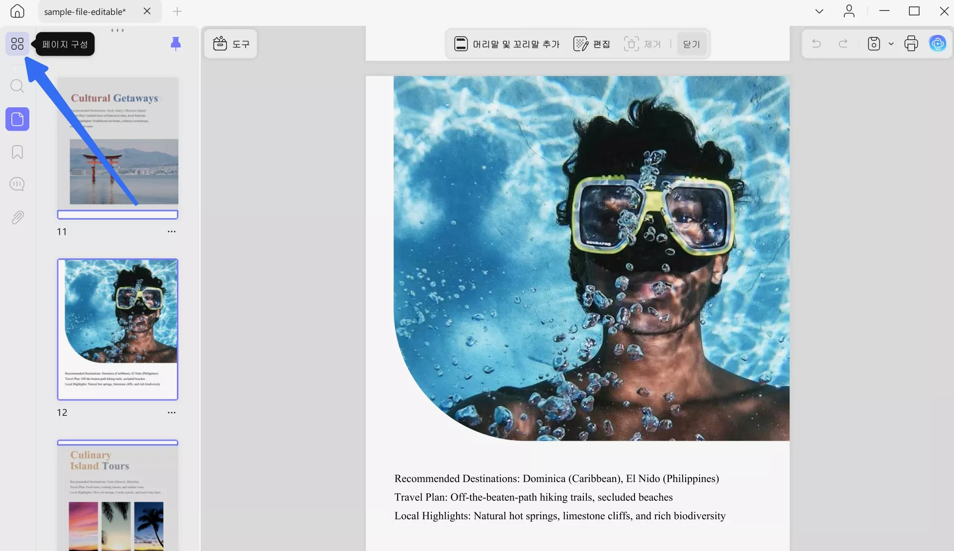 페이지 구성 모드에서는 썸네일 미리보기를 확대하거나 축소할 수도 있습니다. 이 기능은 특히 텍스트가 작은 PDF를 정리할 때 유용합니다.