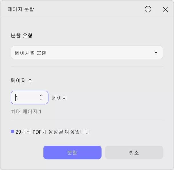 이 옵션을 사용하면 여러 페이지로 구성된 PDF를 여러 개의 작은 PDF로 나눌 수 있습니다. 예를 들어 PDF가 23페이지인 경우, 원하는 개수를 직접 입력하여 최대 23페이지까지 원하는 개수의 PDF로 나눌 수 있습니다.