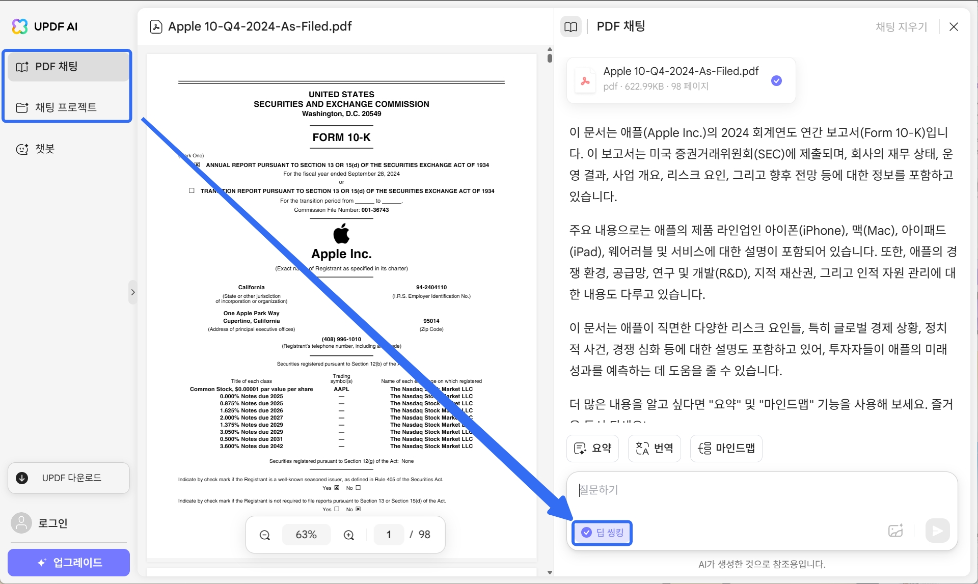 2. DeepThink 모델이 이제 "PDF와 채팅" 및 "프로젝트와 채팅" 섹션 모두에서 사용 가능합니다.