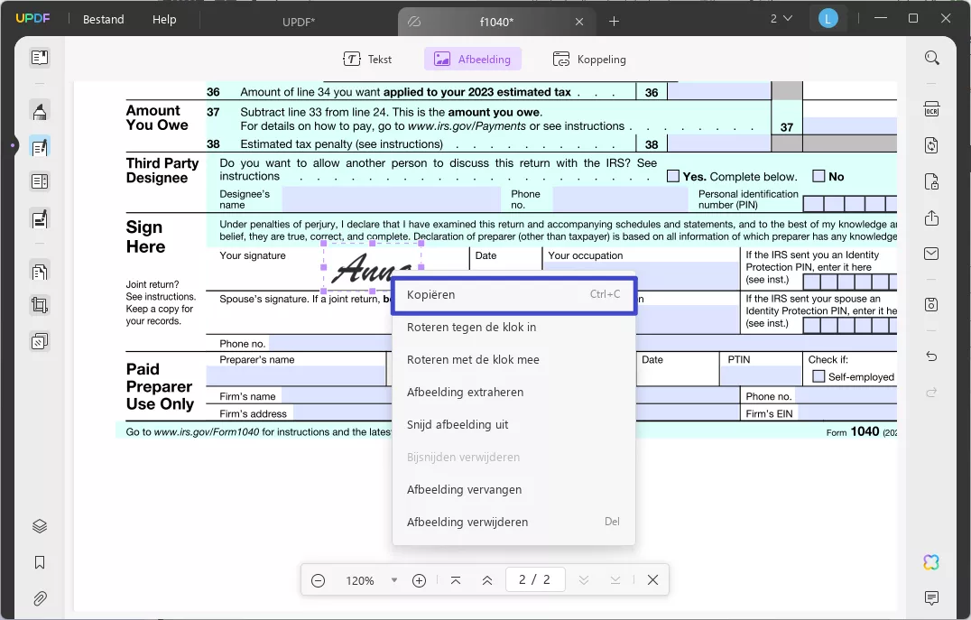 De meest gebruikelijke manier om een handtekening toe te voegen, is door een afbeeldingshandtekening van uw computer te uploaden. In dergelijke gevallen kunt u de afbeeldingen in een PDF-document eenvoudig kopiëren met de UPDF-beeldbewerkingsfuncties. U kunt de onderstaande stappen volgen om een handtekeningafbeelding te kopiëren.