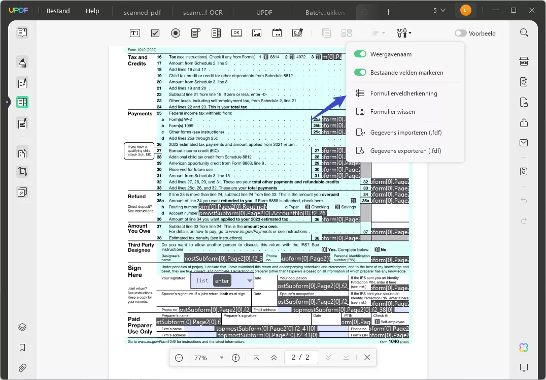 Als uw PDF-formulier is aangemaakt vanuit een Word-document of als het gewoon een niet invulbaar PDF-document is, kunt u de functie "Formulierveldherkenning" van UPDF gebruiken om er een invulbaar formulier van te maken.