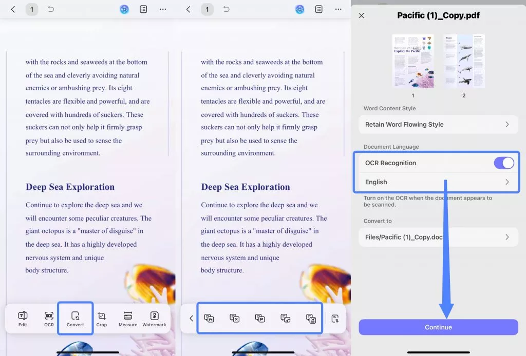 For mobile users, after opening a file in UPDF Mobile, tap Convert in the bottom menu bar → select the format you need, such as Word. In the pop‑up menu, you can toggle OCR Recognition on. It’s that simple!