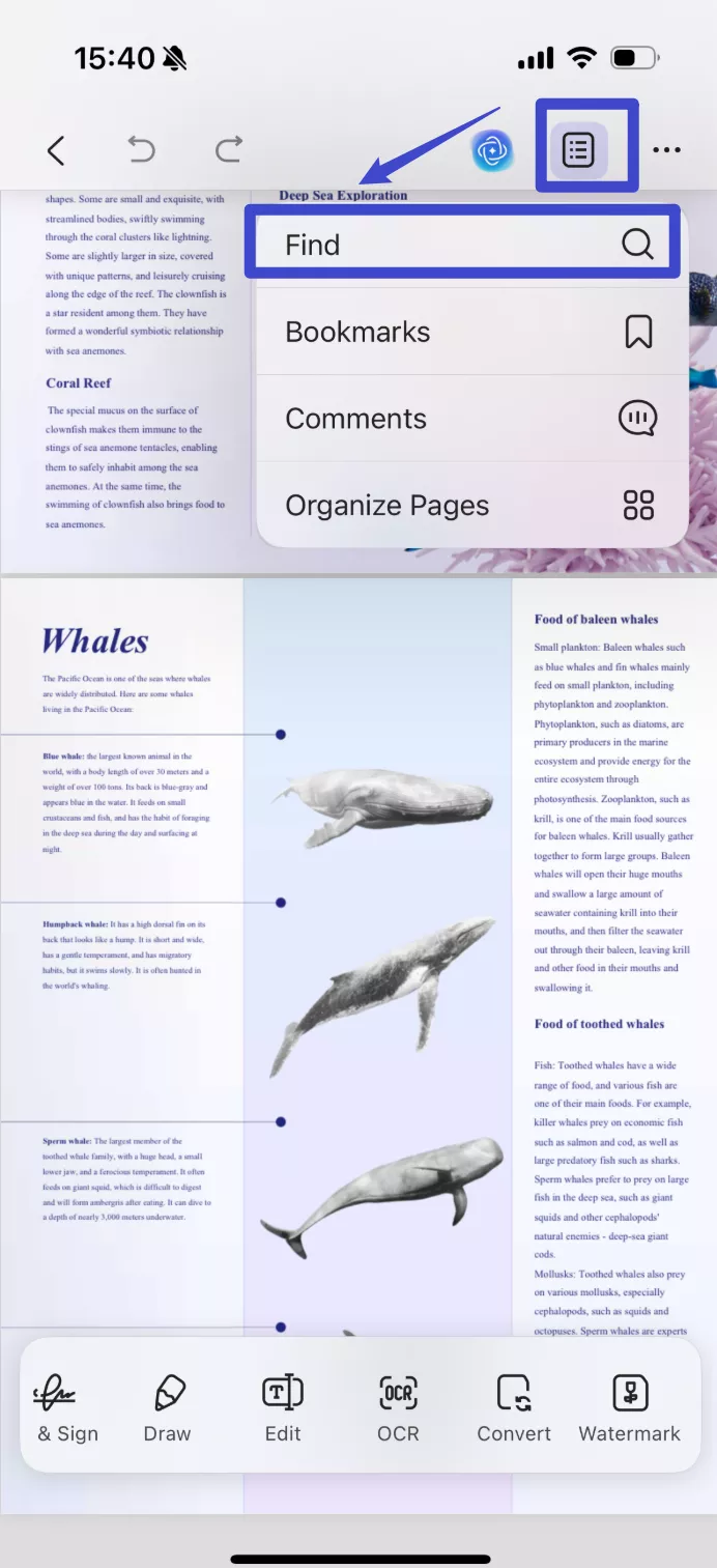 Step 3. Now, on the OCRed PDF, click the button next to the AI icon and choose "Find" from the pop-up window,