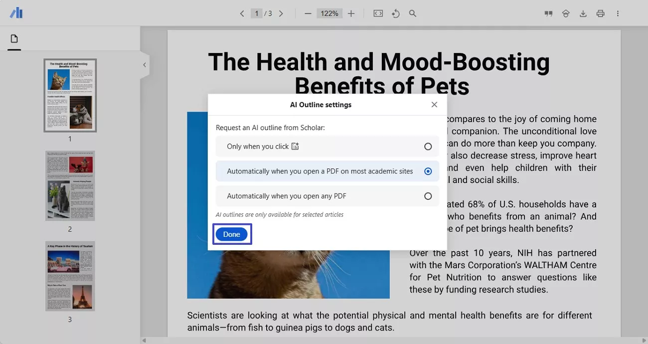 - AI-Generated Outlines: A standout aspect in any Google Scholar PDF Reader review is its AI-generated outline feature. It provides a structured summary of research papers, which makes it easier to navigate and understand complex studies.