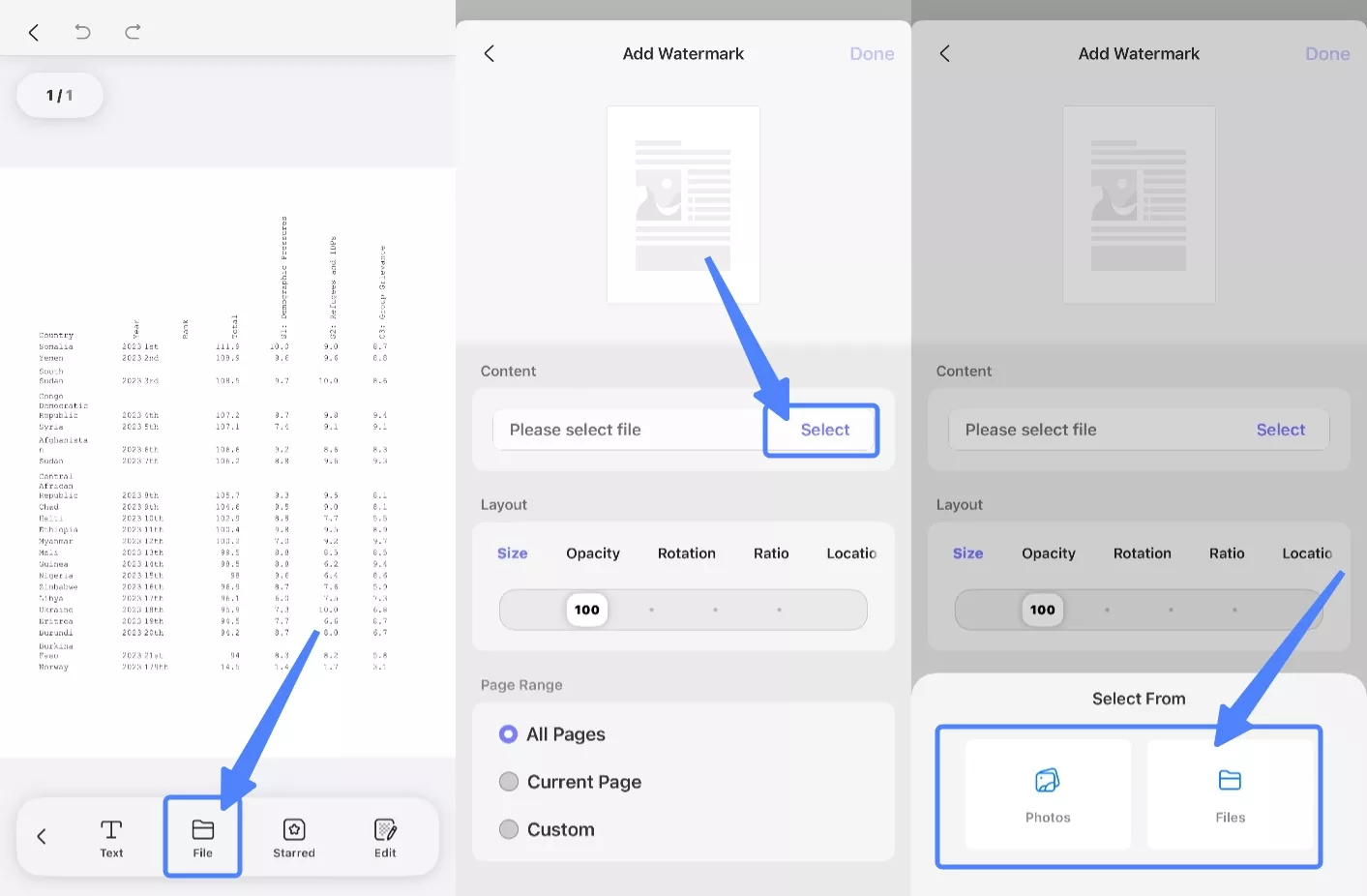 Choose any of the above options, then customize the Layout options. Once you have everything set, tap on "Done" at the top right corner of the screen to apply your created watermark. Don't forget to save the file afterward.